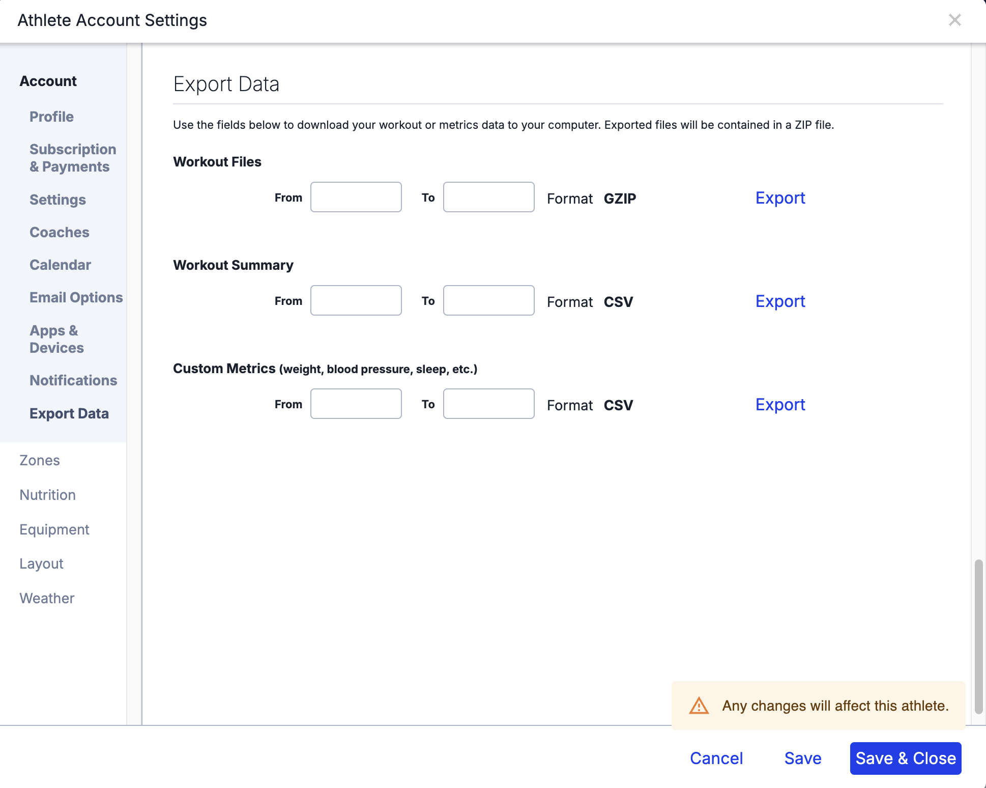 Under Workout Files, choose the date range you’d like to export (e.g., one year).