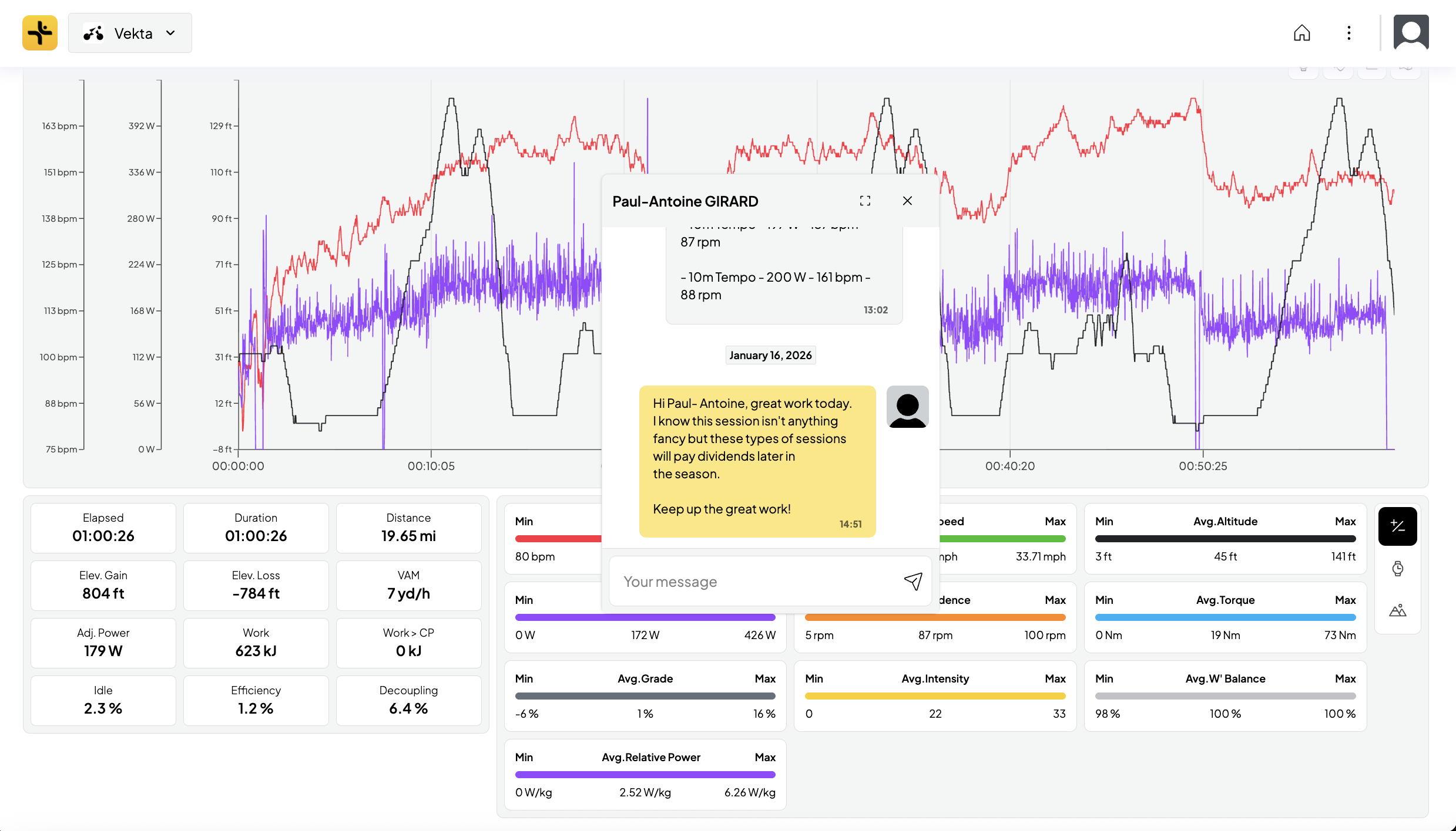 Effective post-session feedback is crucial for enhancing communication between coaches and athletes, fostering a deeper understanding of training progress, and facilitating timely adjustments to training plans. Vekta's new Post-Session Chat feature streamlines this process by enabling direct discussions within the platform.