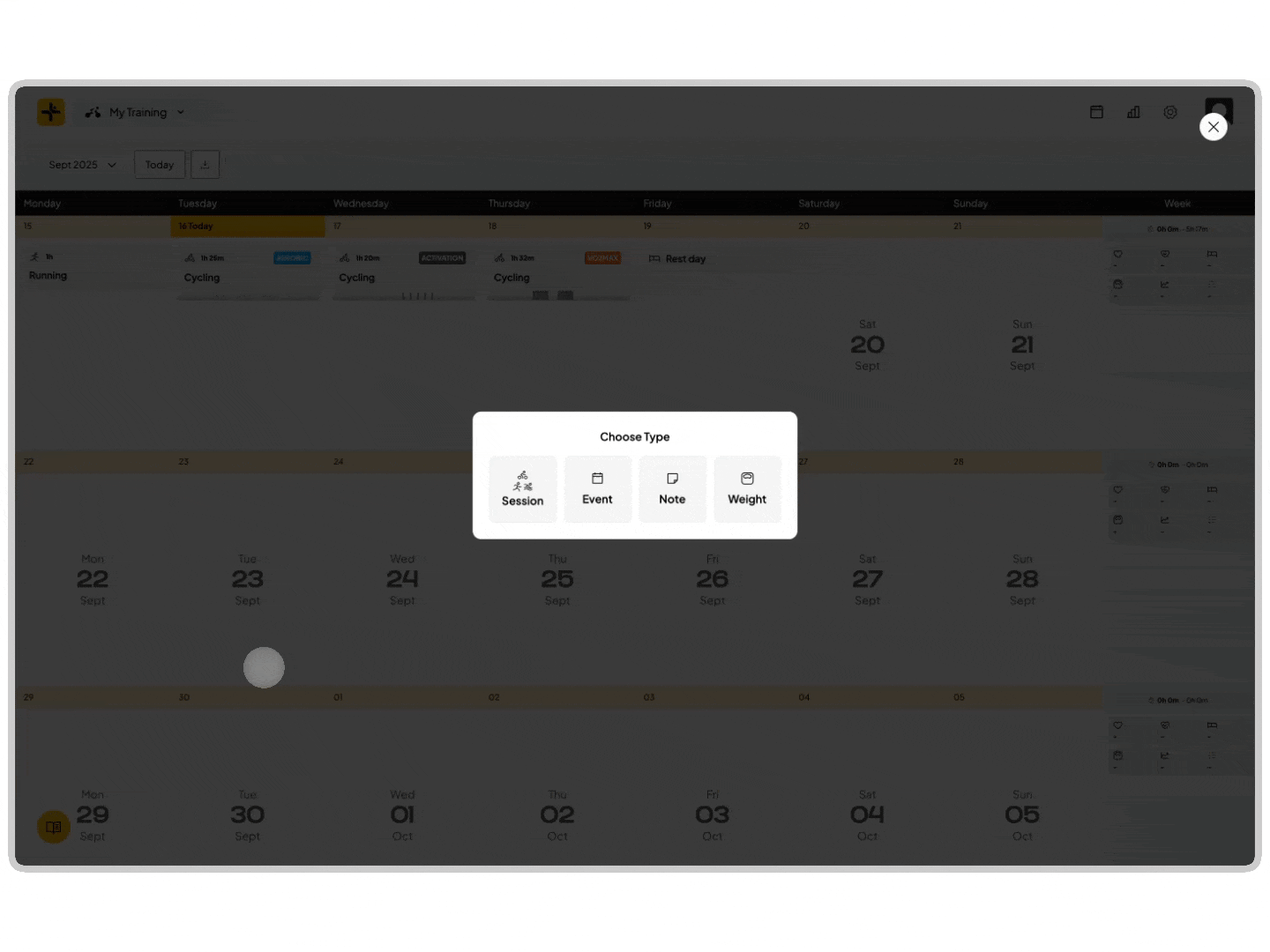 To Create a Session, hover over a day and select the + icon to add a planned workout or event.Create notes
