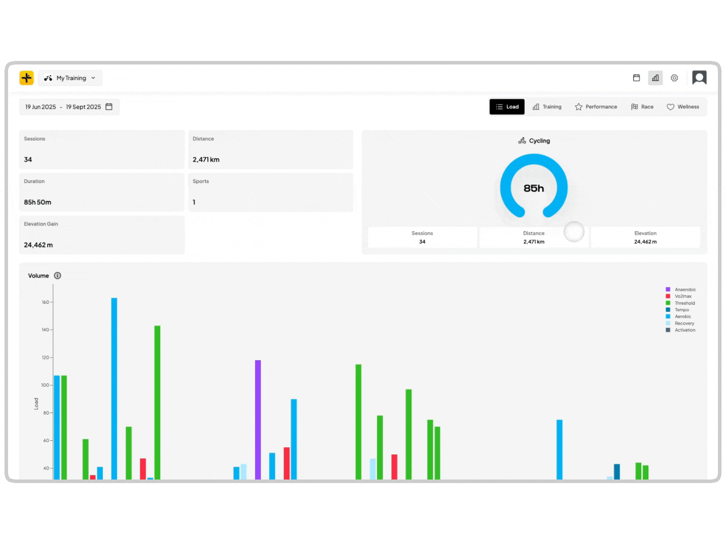 Track training volume and intensity distribution over time to see how work is accumulating. Identify trends in workload and how they relate to performance and recovery. Learn more about Vekta LoadTraining
