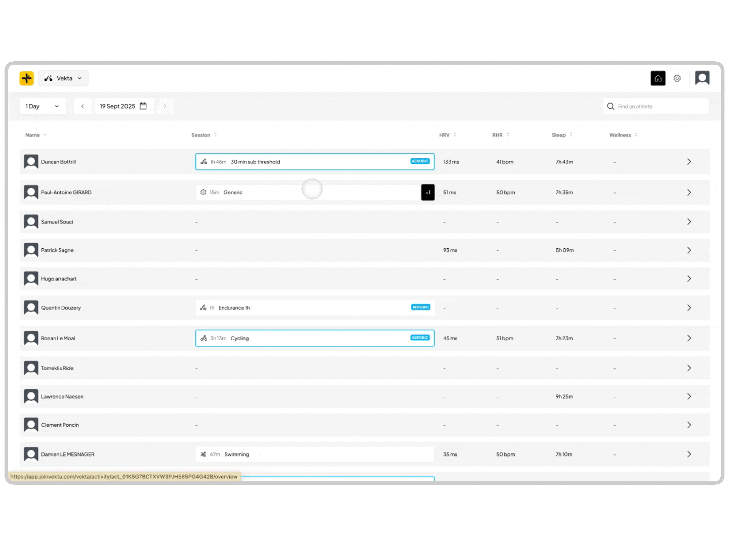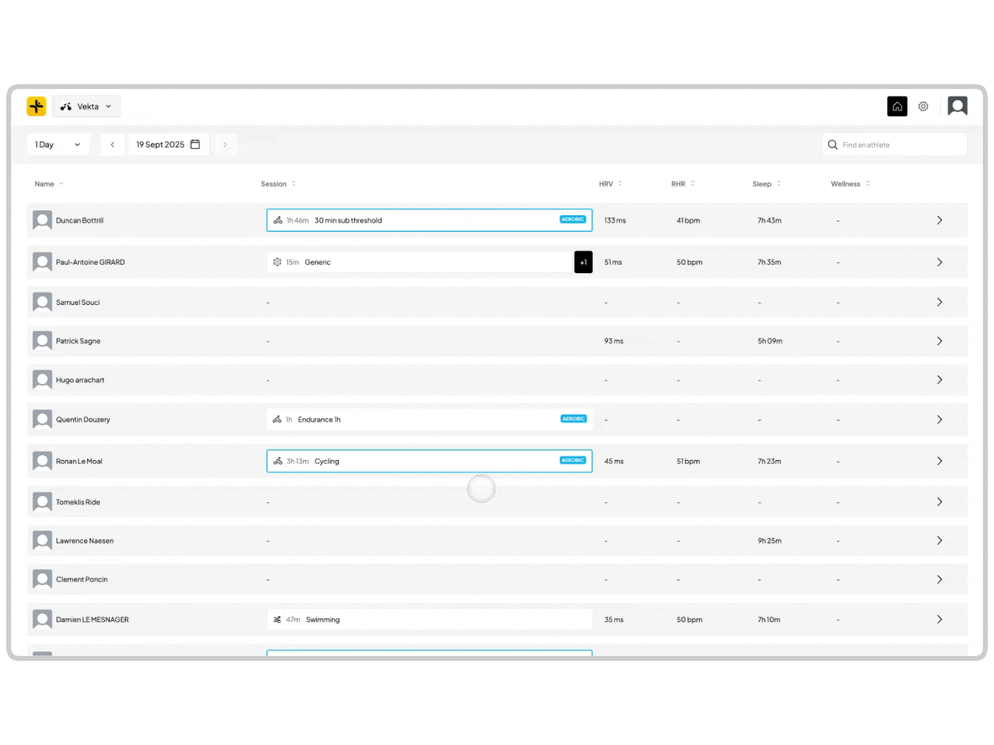 The Coach Dashboard gives you a clear overview of all your athletes’ training and recovery status inside a Workspace.