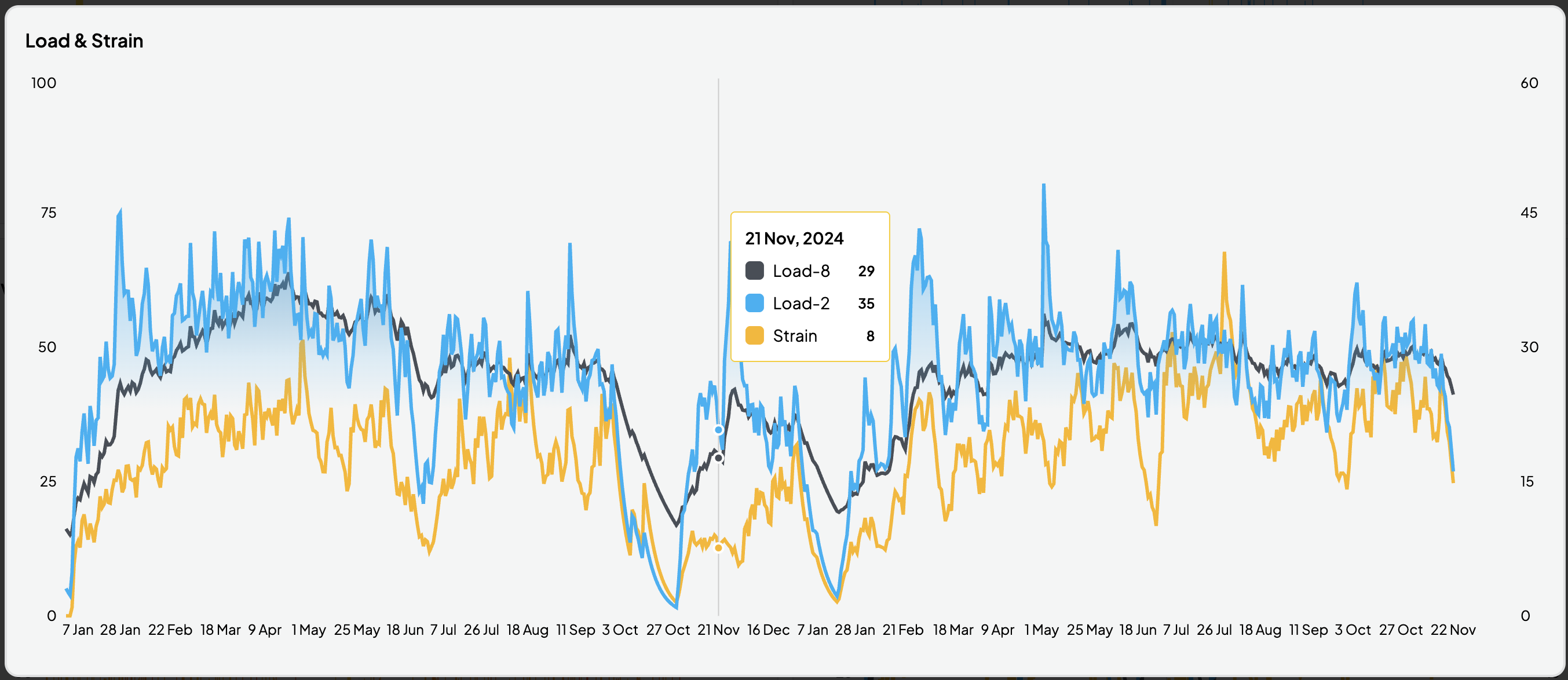 Load-8 gives you insight into your aerobic base development, chronic training stimulus, and how much cumulative strain your body has adapted to over time.