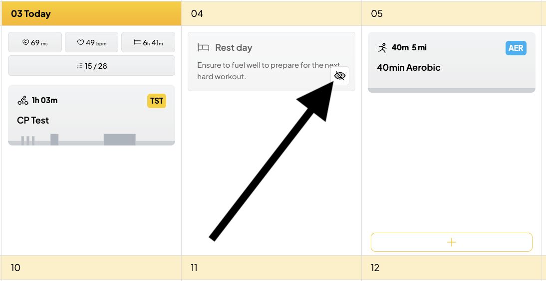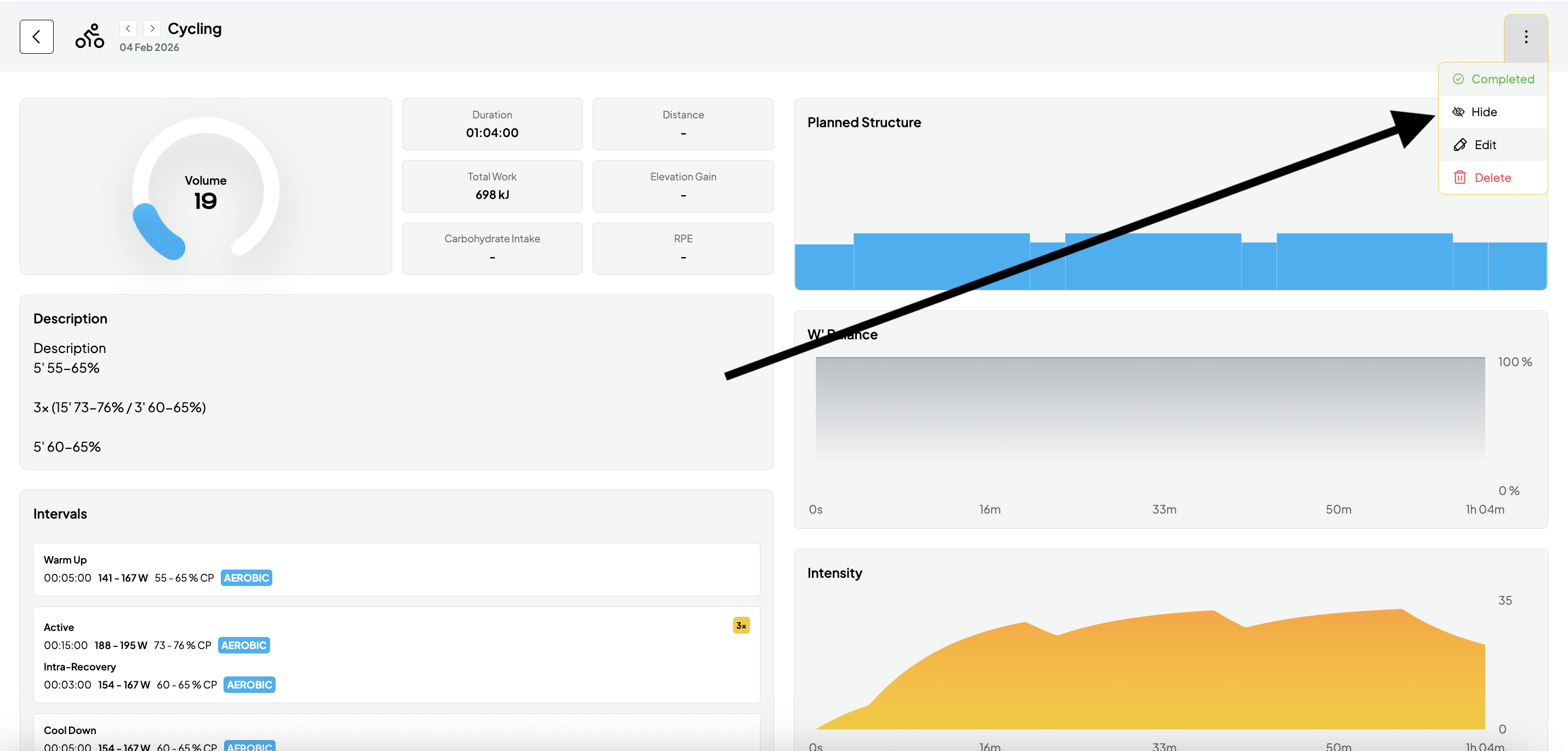 Existing Workouts: To hide a planned Workout, click into the session from your Calendar to Edit the workout (or E + click). Click the three-dot menu (top right) and select Hide.