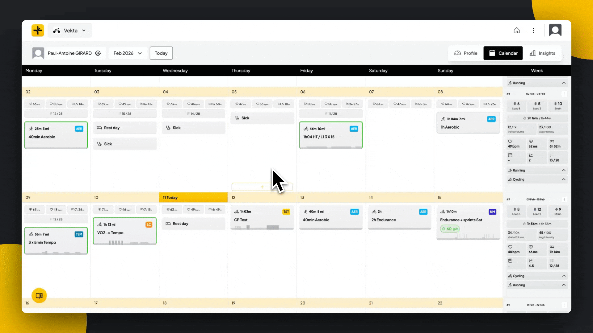 Vektaβs drag and drop resource feature makes it easy to organise your training sessions, events, and notes directly in the calendar.