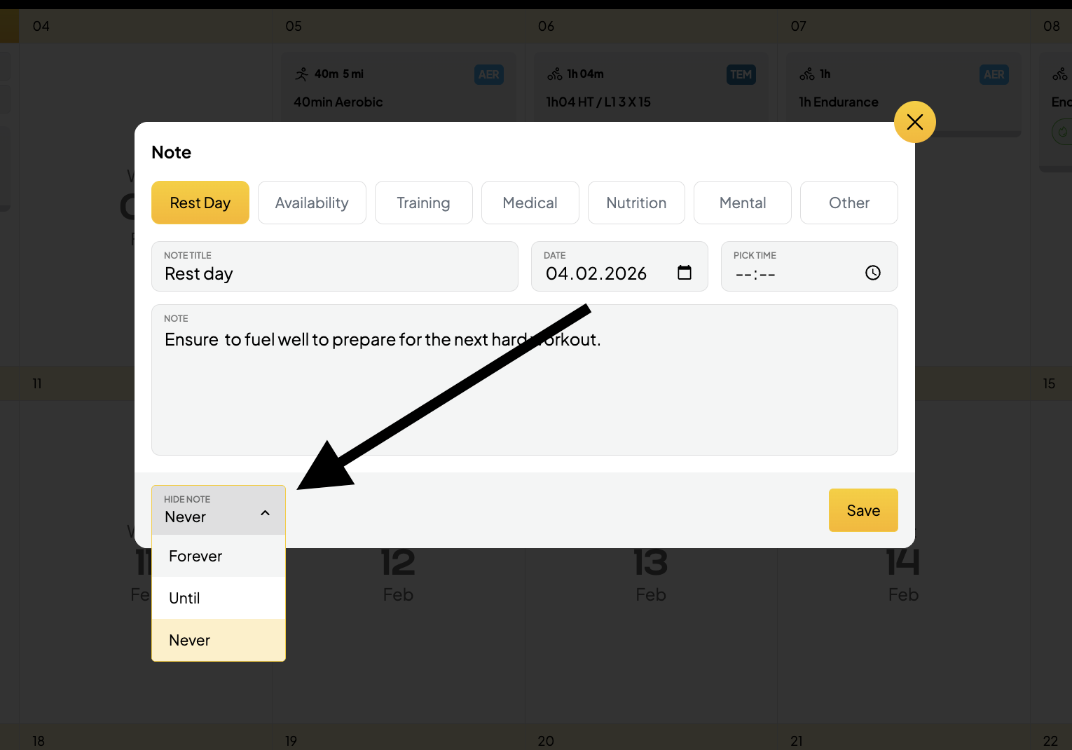How to Hide: When creating or editing a note, look for the Hide Note dropdown in the bottom left corner.